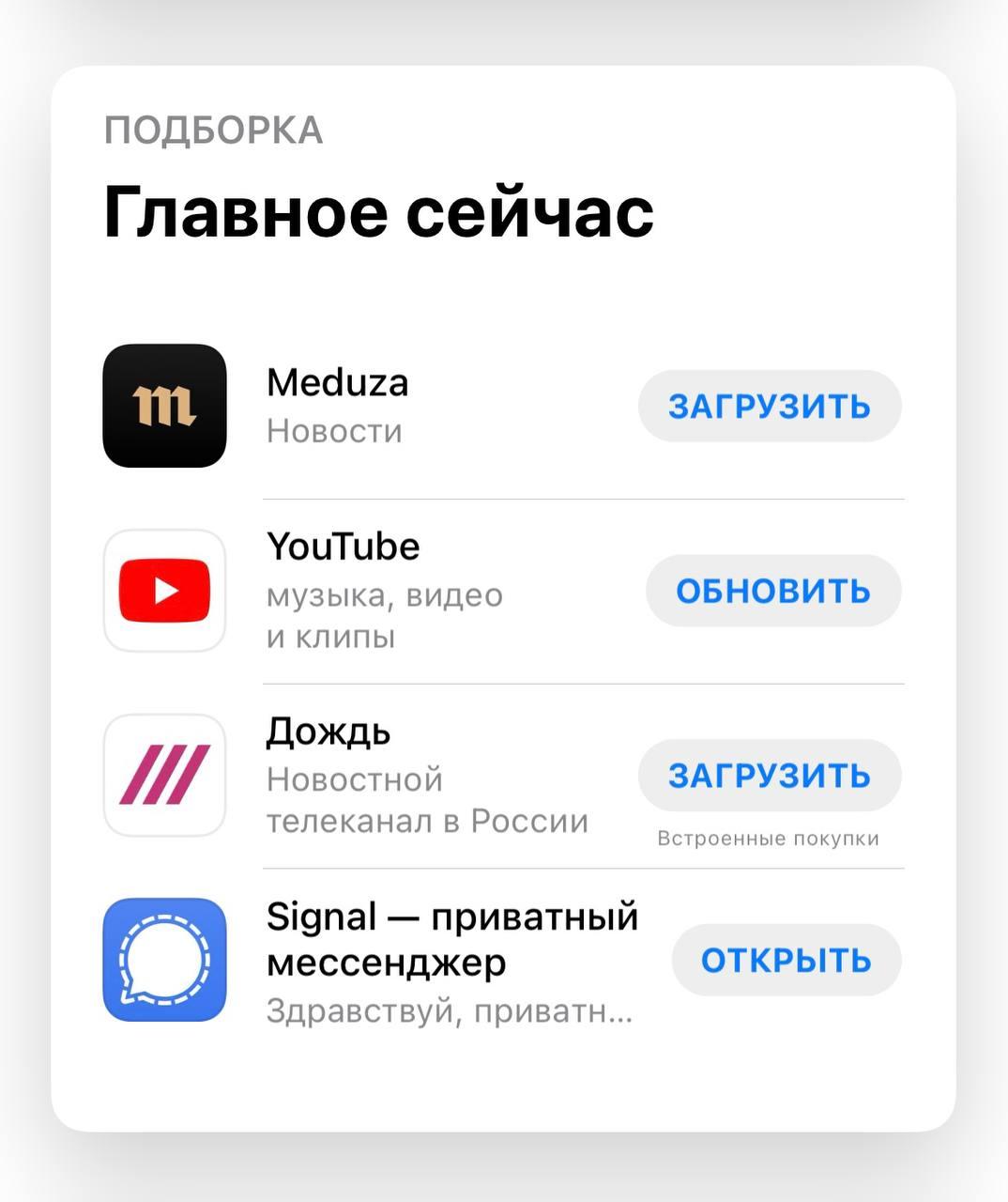 В подборке также приложения «Медузы», «Дождя», чей сайт вчера заблокировали из-за новостей о войне в Украине, а также YouTube и мессенджер Signal.