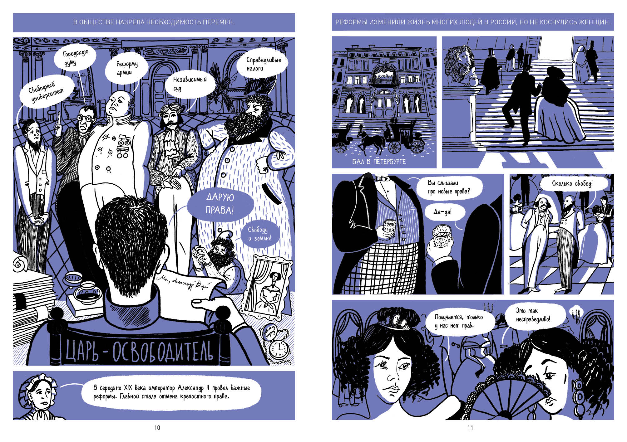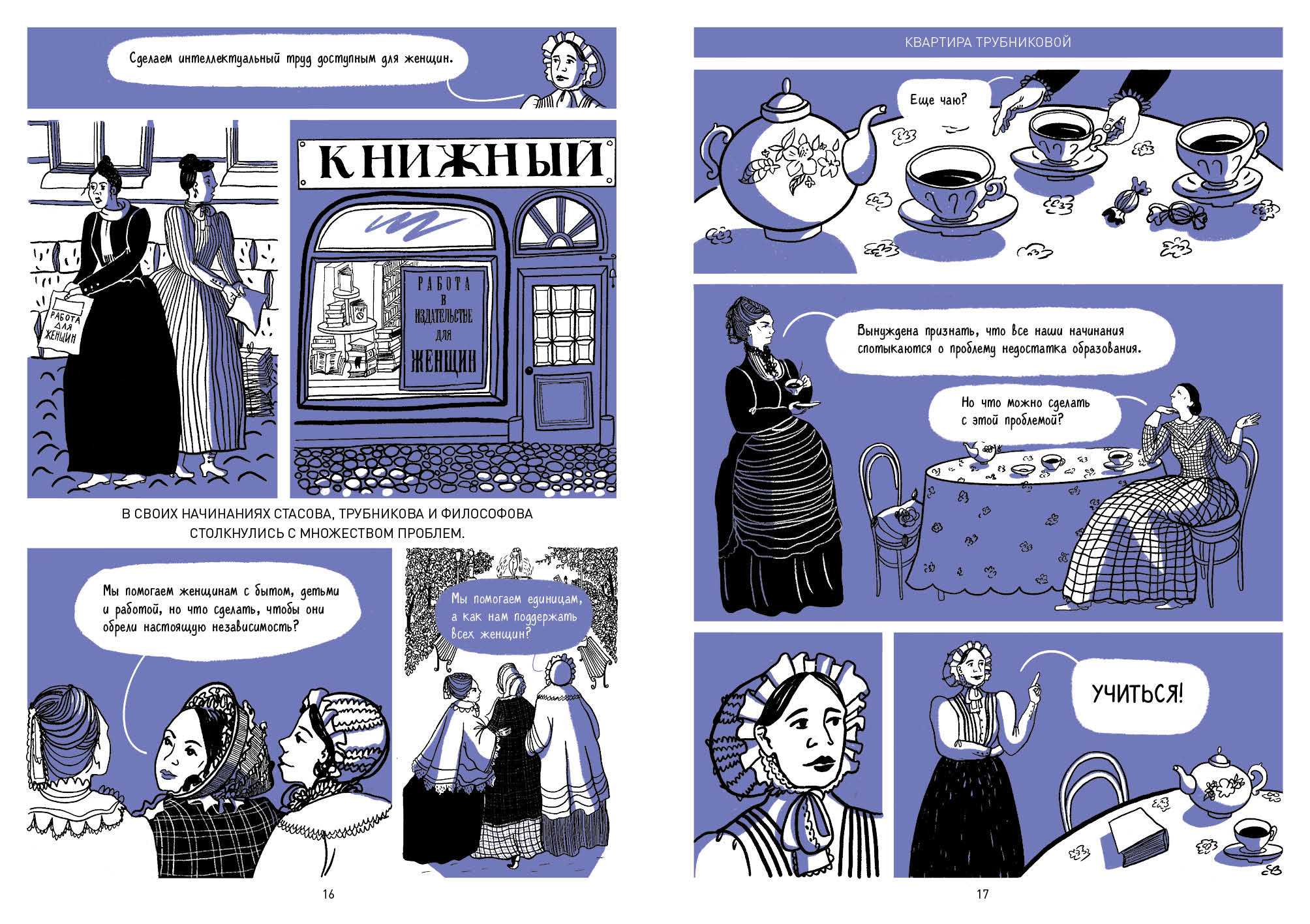 В комиксе рассказывается, как в XIX веке три петербурженки боролись за право женщин получать высшее образование и работать. Там описывается, как были устроены Бестужевские курсы, кто там преподавал и почему путь женщин в образование занял полвека.