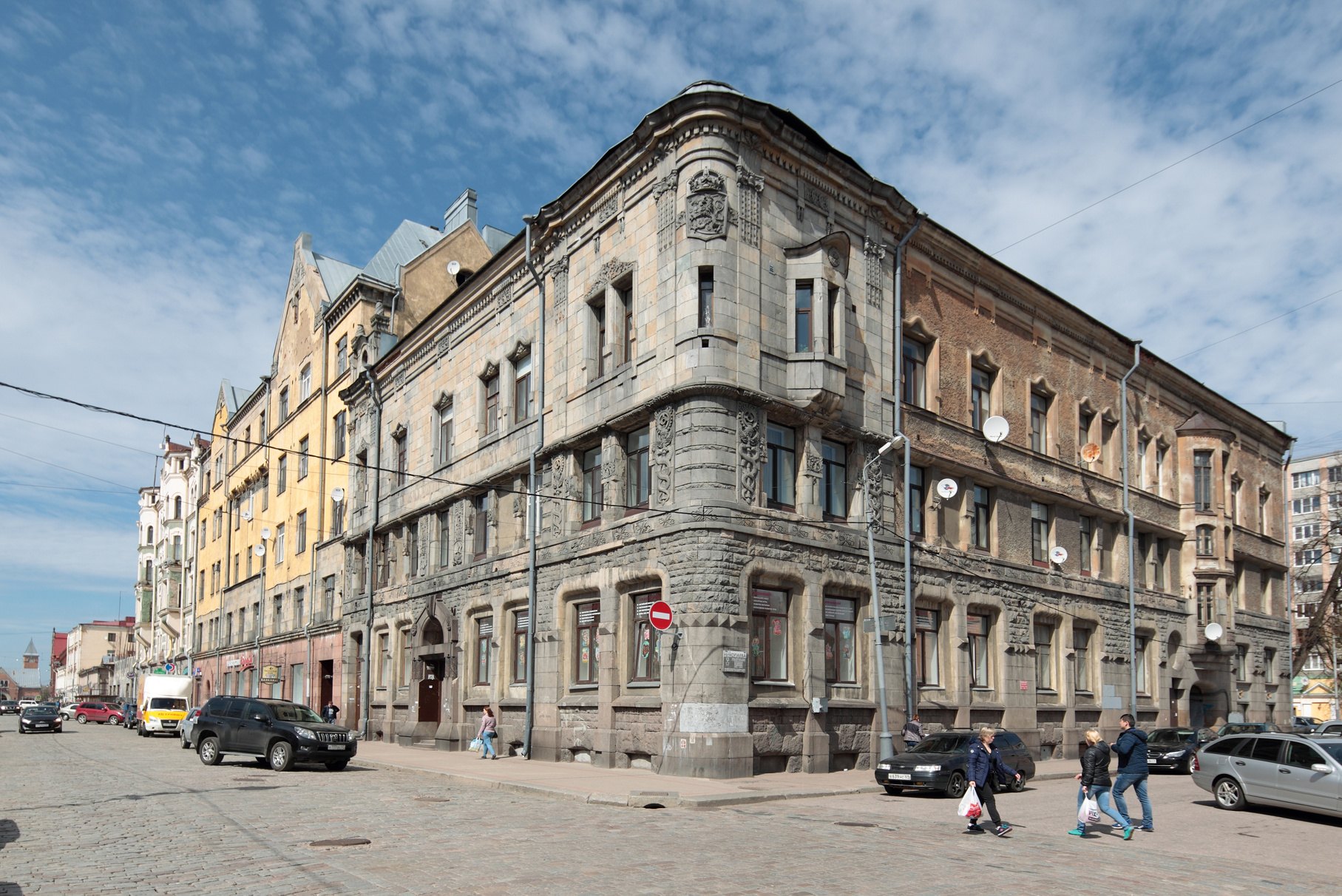 В начале ХХ века Выборг был процветающим городом с мощной промышленностью — прежде всего пищевой, лесной и судостроительной. Состоятельные предприниматели и богатые фирмы заказывали местным и приезжим архитекторам доходные дома и офисы в популярнейшем тогда стиле — финском национальном романтизме. Его легко отличить по гипертрофированным средневековым мотивам вроде башенок и крутых готических кровель, сложному декору с финскими национальными и природными орнаментами, фигурам сов или медведей, использованию местных материалов — тесаного гранита. Большинство памятников модерна в Выборге находятся на центральной улице выборгского Нового города, проспекте Ленина (бывшей Торкильской), и вокруг Красной площади — когда-то площади Красного колодца.
