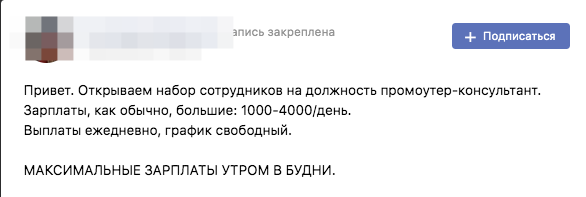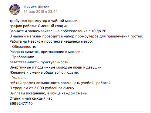 Продавцы и промоутеры сами активно ищут новых сотрудников, открыто размещают на своих страницах во «ВКонтакте» объявления.