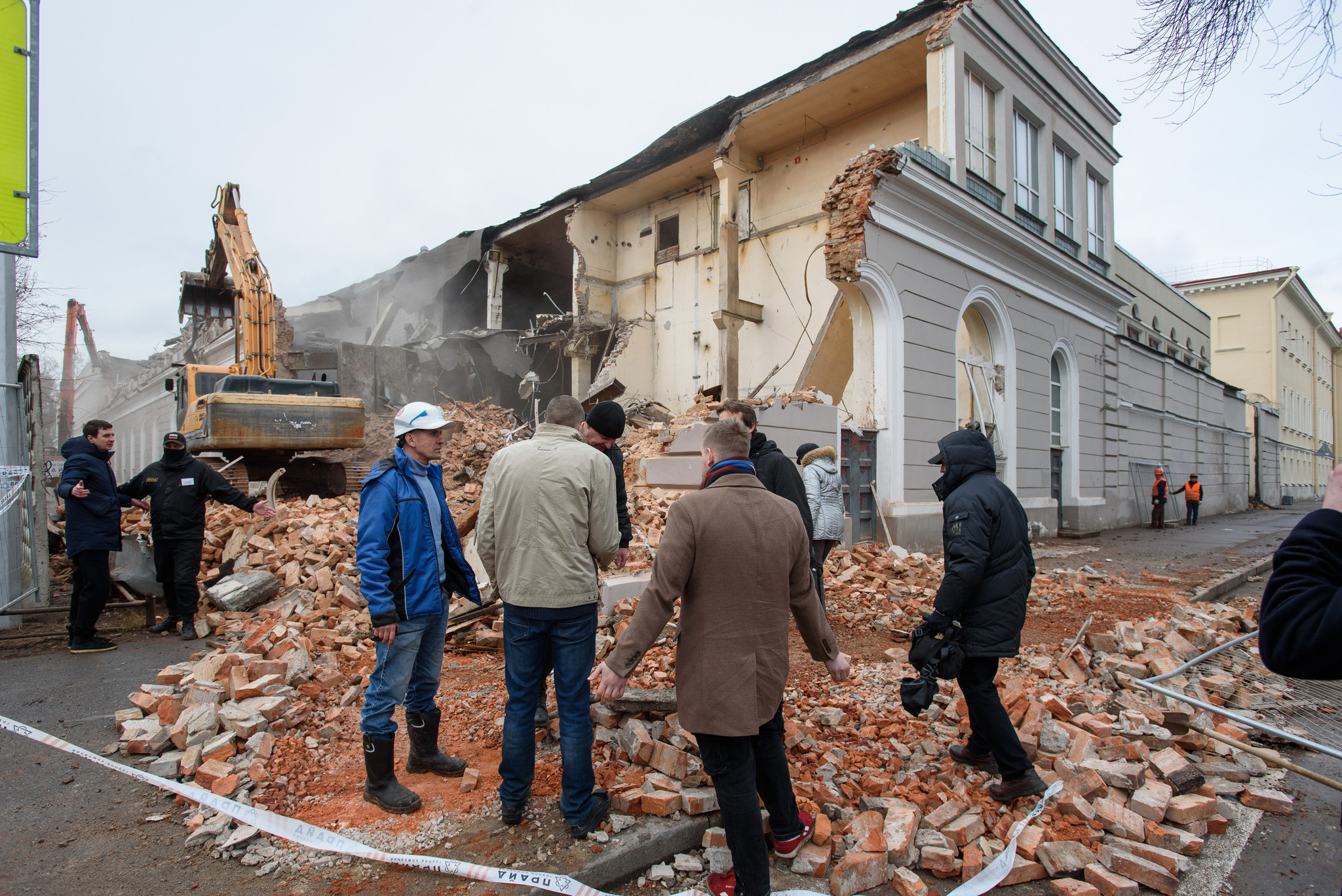 В день сноса нанятым застройщиком «охранникам» несколько часов удавалось оттеснять от здания активистов. Многие из «охранников» были в масках, защитники здания позднее утверждали, что часть нанятых мужчин была пьяна. Кто-то из активистов пытался поговорить с людьми из оцепления, кто-то то с одной, то с другой стороны выкрикивал оскорбления. В какой-то момент активисты прорвали кольцо и остановили работы, в дело вмешалась полиция, но задерживала она только активистов.