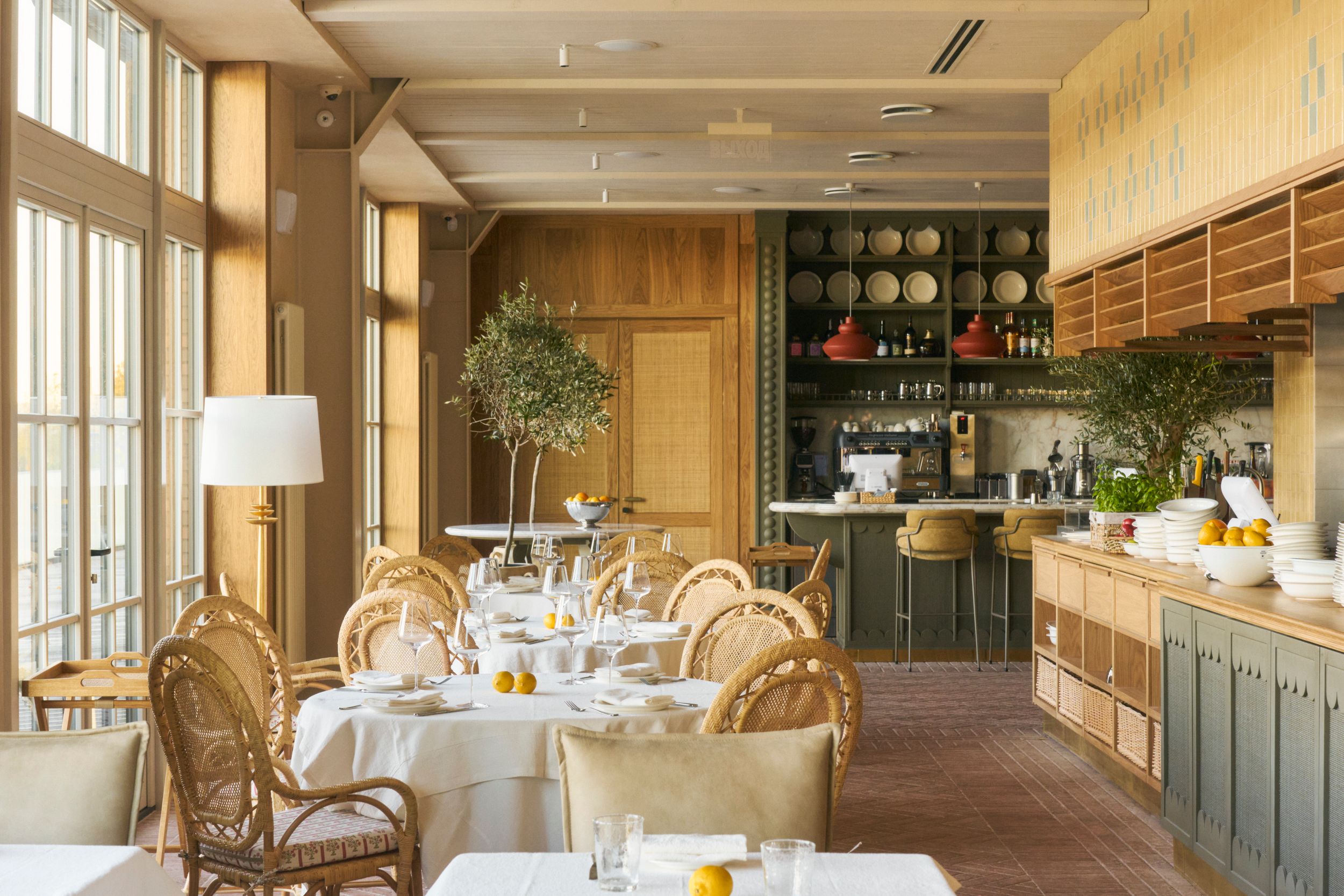Ресторан расположен между Лазаревским и Большим Петровским мостами, из окон открывается хороший вид на «Газпром-арену» и «Лахта-центр». Интерьер разработало бюро eshe.studio: потолок сделали деревянным, в зале установили камин, а в оформлении помещения использовали ротанг, мозаику и испанские ткани.