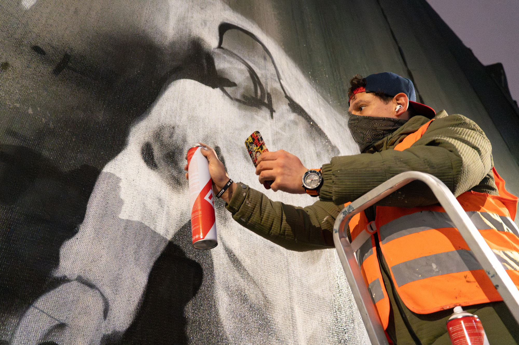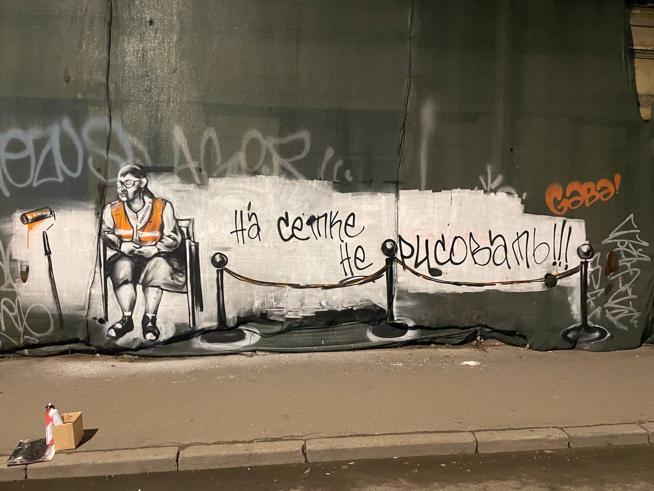 — Посыл у каждой работы свой. В последнее время больше работ делаю на временных строительных заграждениях. Мне очень понравилось работать на фасадной сетке. С одной стороны, это привлекает внимание, что здание стоит обтянутое сеткой, и не факт, что о нем в ближайшее время вспомнят. Один посыл такой. А второй посыл — графический, текстовый, информационный. И когда эти посылы сочетаются — это допустимое поле в рамках современного административного и уголовного законодательства. Памятники я, естественно, не трогаю, свежеотреставрированные дома и поверхности тоже. А если стена уже запачкана, кто-то накалякал, начирикал, какие-то глупости написал, то почему бы сверху не сделать что-то красивое?