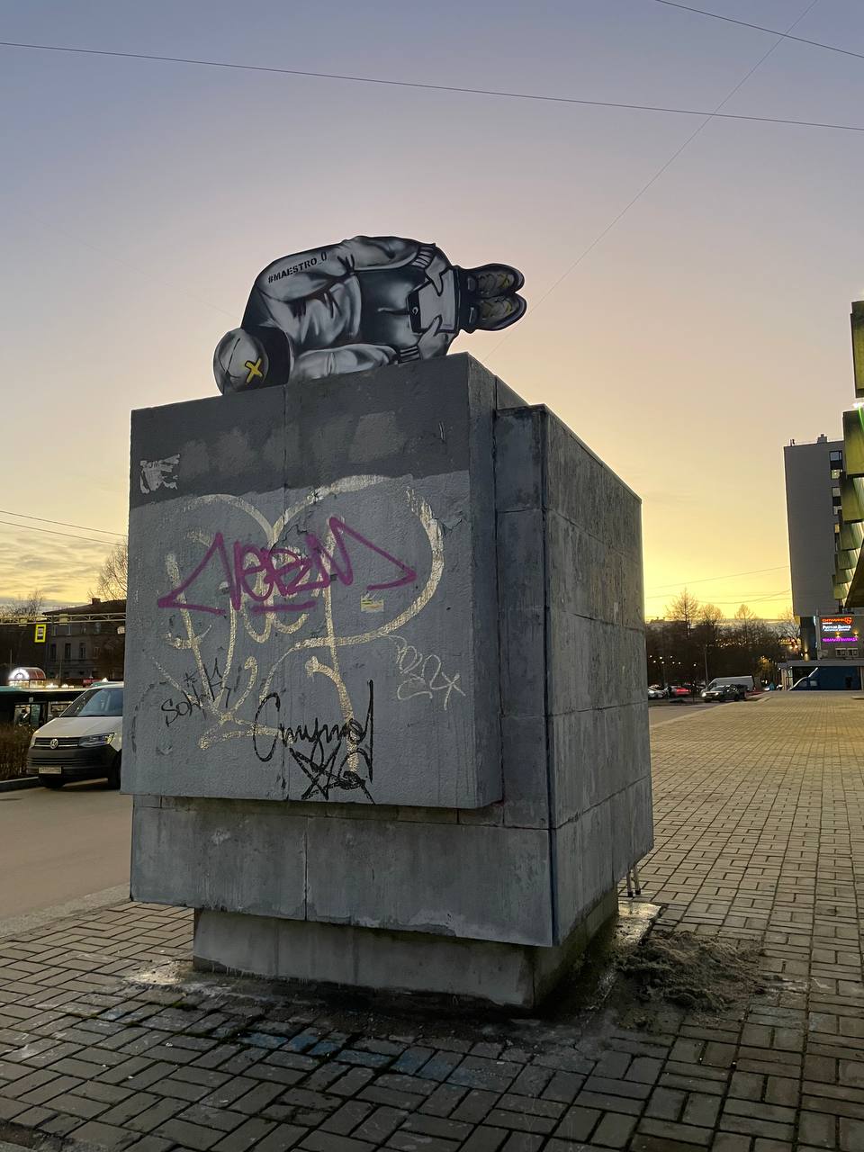 Был у меня еще объект, который назывался «Отдых на кубе». Я на площади Мужества устанавливал на кубе из фанеры фигуру, которая лежит и залипает в планшет. И «Отдых на кубе» — тоже игра слов, что это не страна, а бетон. И отдых заключается в том, что это та же самая прокрастинация.
