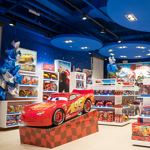 В магазине продаются игрушки и атрибутика по произведениям студии «Дисней», в том числе по «Звездным войнам» и кинокомиксам Marvel.