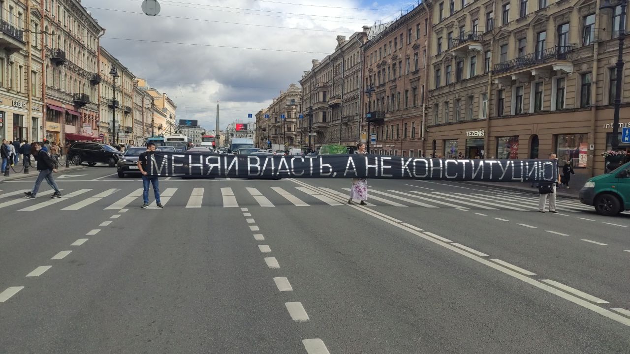 Несколько активистов растянули баннер «Меняй власть, а не Конституцию» поперек проезжей части Невского проспекта днем 16 июля. Фото и видео акции опубликовали телеграм-каналы «Объектив реалий» и «ЯГражданин».