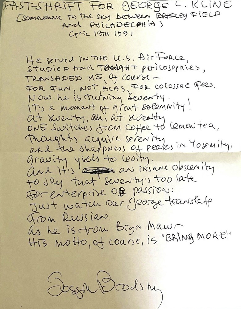 Автограф Иосифа Бродского со стихотворением, посвященным юбилею Джорджа Клайна. 1991 год. Фото: Анатолий Найман