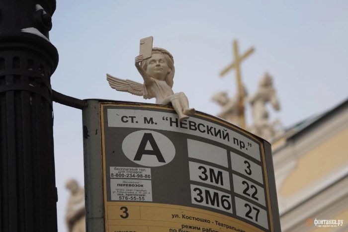 В понедельник, 27 декабря, на знаке напротив базилики святой Екатерины заметили фигурку ангела, делающего селфи. Фотографии опубликовала «Фонтанка». А «Бумага» связалась с автором стрит-арта и узнала, что значит скульптура.