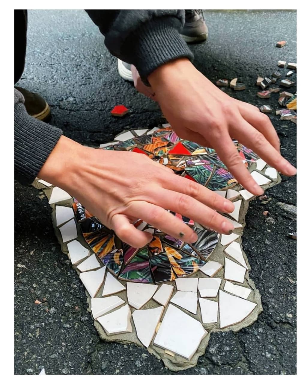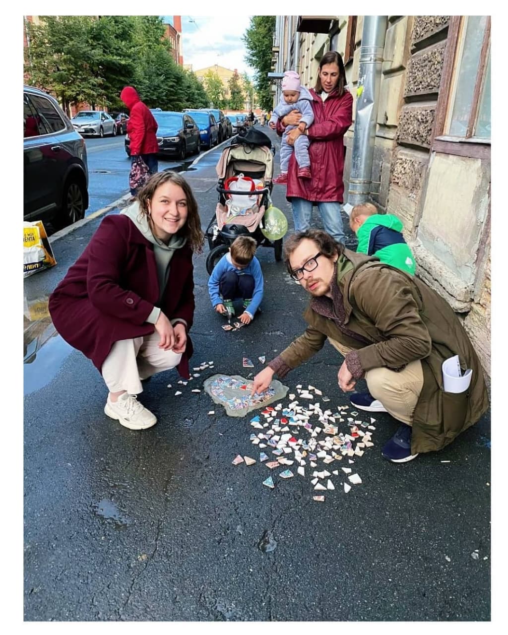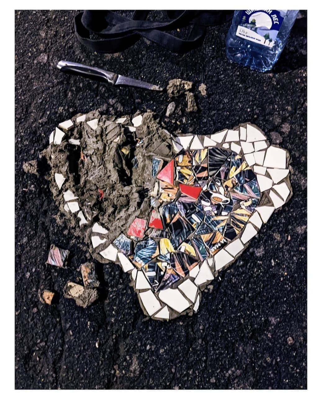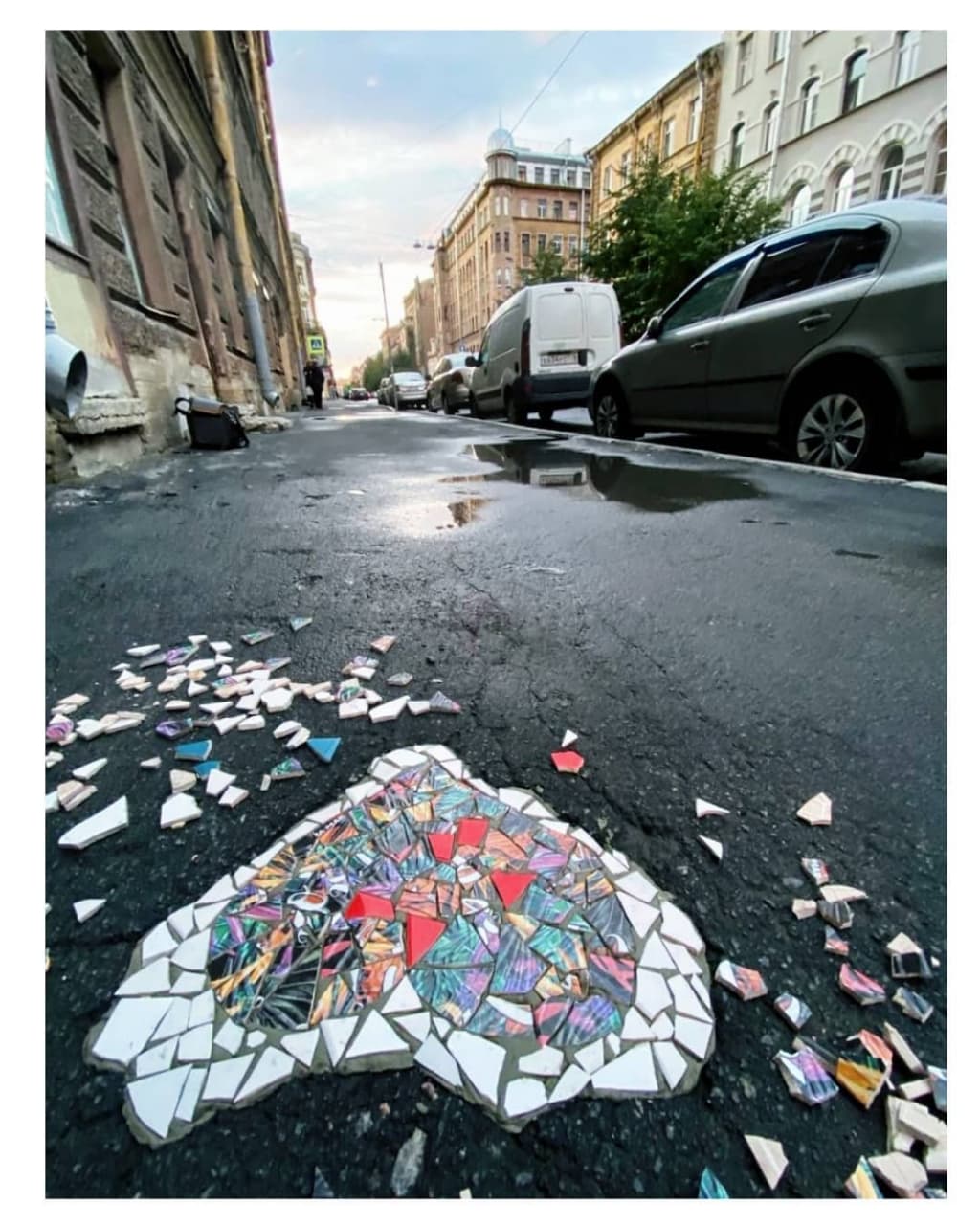 Первой задели яму в форме сердца. Однако вскоре поздно вечером неизвестный сломал арт-объект — по всей видимости, случайно наступив на него. Жители начали реконструировать мозаичное сердце и заметили рядом еще одну яму — в ней тоже выложили мозаику.