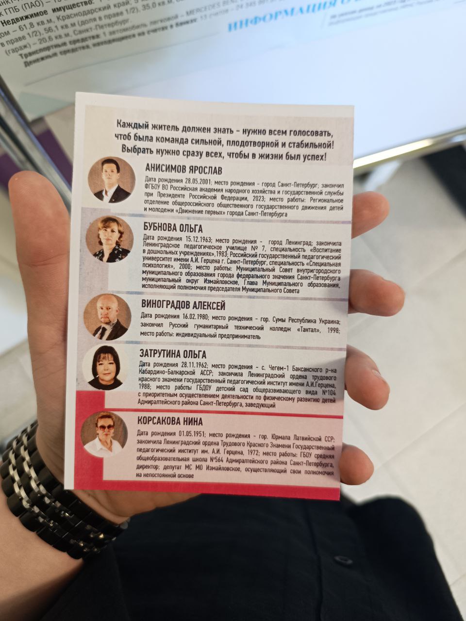 Голосующим этих пятерых кандидатов представляли как «действующих депутатов», хотя из пятерых действующими являются только Ольга Бубнова и Нина Корсакова, убедилась «Бумага». Как минимум на двух человек, по словам собеседницы «Бумаги», агитация подействовала, и избиратели отметили в бюллетенях все пять фамилий. Еще в одной квартире избирательница заметила листовку только после голосования, в третьей — ее не доставали.