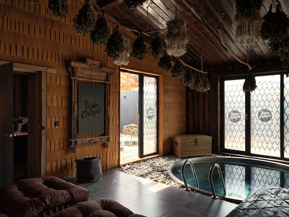 Банный комплекс в Пушкинском районе находится примерно в 20 километрах южнее станции метро «Московская», его открыли в 2024 году. Пространство поделили на пять бань разной вместимости (от 2 до 25 человек) — с парными, зонами отдыха и купелями на террасах. Бани отличаются по интерьеру и атмосфере: например, в одной из них собрали библиотеку с этнографическими очерками и сказками. Все уходовые процедуры и программы вдохновлены банными традициями Русского Севера, стоимость бронирования бани — от 5 тысяч рублей за час.