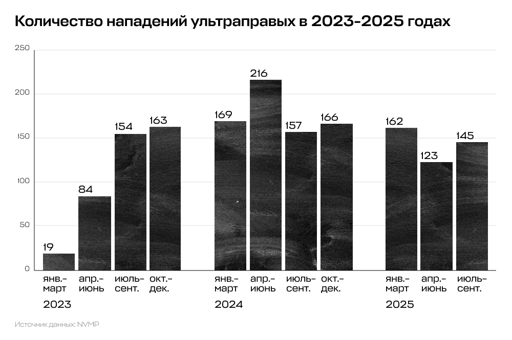 «Сова» включает в эту статистику только наиболее жестокие нападения, а Nazi Video Monitoring Project работает со всеми видео, которые в своих каналах публикуют ультраправые. По данным проекта, еще в марте 2023 года за месяц по стране произошло 9 нападений, а уже в апреле — 38 нападений. К сентябрю их количество достигло 66 и продолжило расти вплоть до мая 2024 года — до 83 нападений в месяц. После этого рост прекратился, а с весны 2025-го даже наметилось небольшое падение — до 30–50 нападений в месяц. Эта динамика совпадает с наблюдениями «Совы». В Nazi Video Monitoring Project связывают резкий рост неонацистского насилия в 2023-м с началом государственной антимигрантской компании, а замедление роста и спад в 2024–2025 годах — с тем, что на ультраправых вновь обратила внимание полиция. Результатом работы силовиков стал, например, арест администратора крупного неонацистского канала «Проект Разгром».