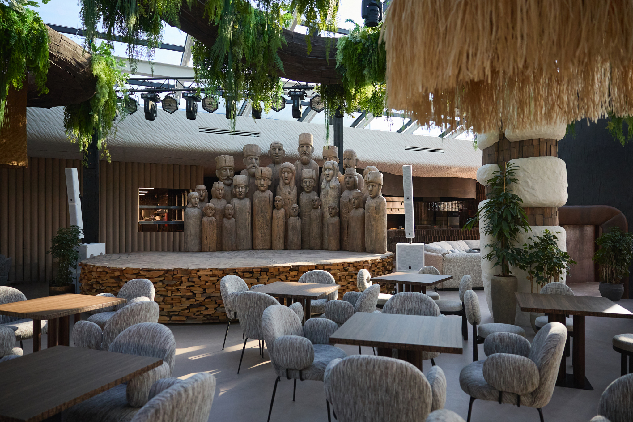 Ресторан получился масштабным. «Машараби» занимает помещение площадью более 1 000 квадратных метров, рассчитанное на 400 посадочных мест (еще 70 гостей могут разместиться на всесезонной видовой террасе). Интерьер разработала международная студия Megre Interiors: дизайнеры украсили залы виноградной лозой, скульптурами и арт-объектом в виде тела дракона.