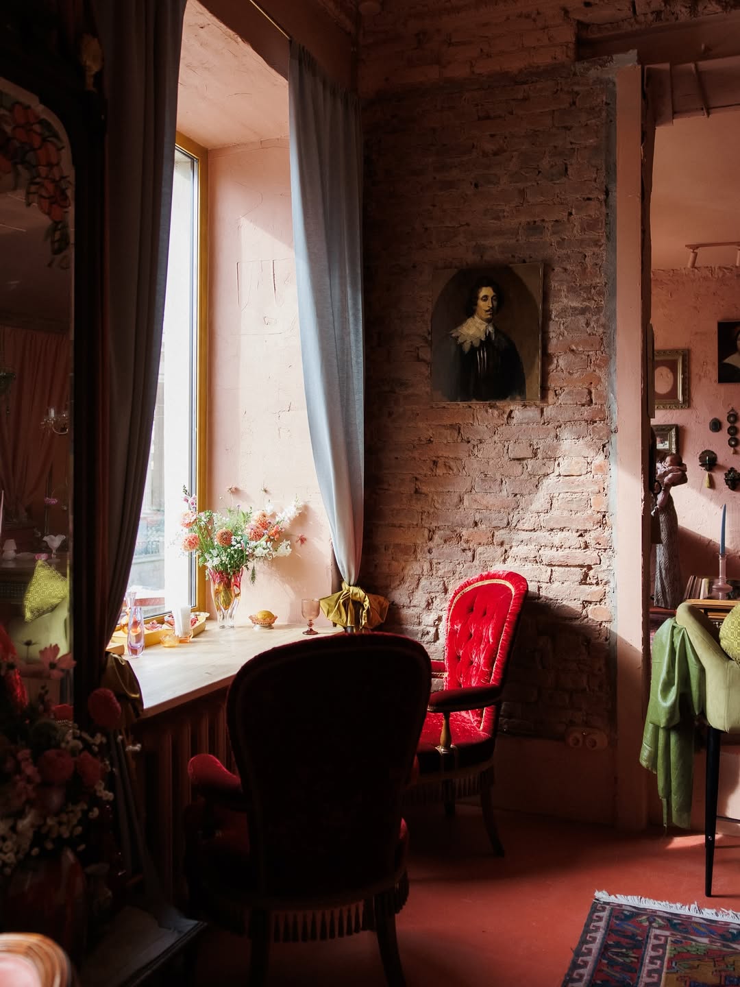 Веганское кафе напротив Казанского собора открыла блогер Рада Русских, визажист и создательница бренда косметики Gedonist. Двухэтажное помещение оформили в теплых розовых тонах и украсили винтажными предметами: мебелью, люстрами, зеркалами. В Gedonist также устраивают разные события: от «вампирских балов» до лекций о масонстве.