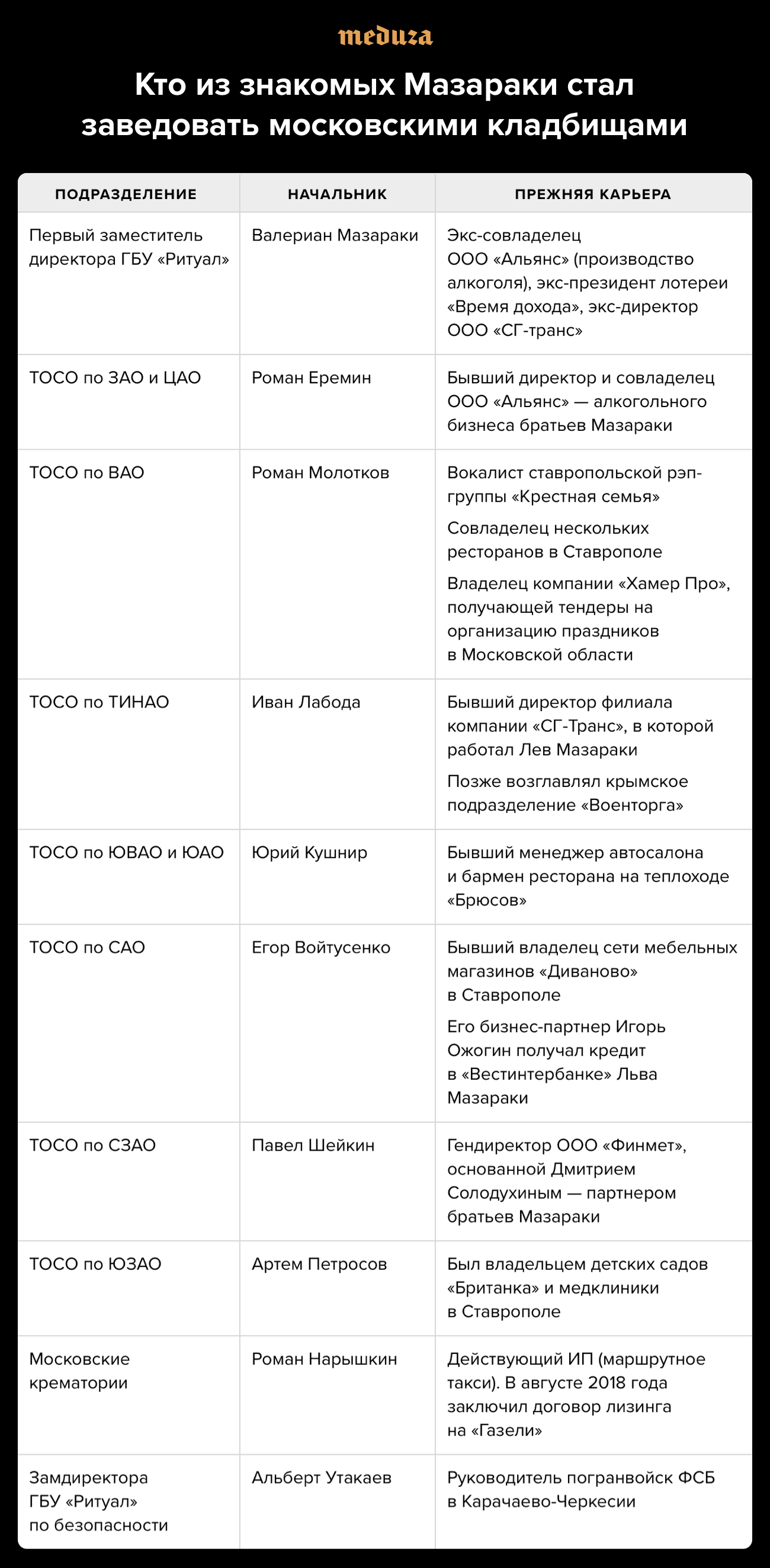 После ареста Чабуева и увольнения его друзей из ГБУ «Ритуал» почти все московские кладбища возглавили выходцы из Ставропольского края.