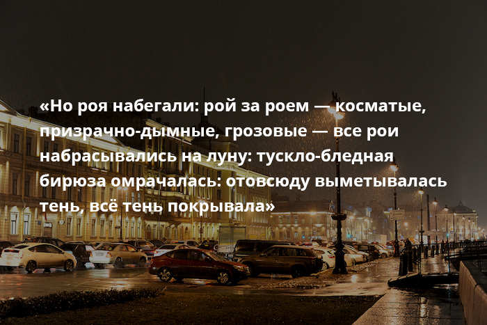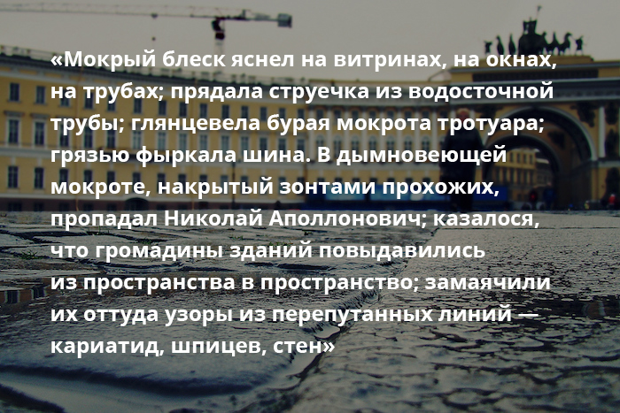 В качестве примеров-иллюстраций мы использовали цитаты из романа «Петербург» модерниста Андрея Белого, создавшего то ли выдуманный, то ли подлинный и вневременной образ города.