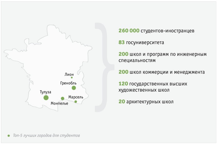 Поступив в учебное заведение, студент может попробовать получить место в государственном общежитии, но это бывает очень редко. Чаще иностранцам приходится искать жильё в частном секторе. Большинство студентов, конечно, стремится в Париж. Однако это не самый удобный для студентов город: жильё и вообще жизнь в столице очень дорогая. В топе наиболее благоприятных для студенческой жизни городов Париж только на десятом месте, первые пять заняли Тулуза, Гренобль, Монпелье, Марсель и Лион. Даже в этих городах проживание обойдется минимум в 6000 евро за год. Образование во Франции не бесплатное, но доступное. Программы лисанс, мастер и доктор, соответствующие нашей системе бакалавриат-магистратура-аспирантура, стоят в каждом вузе одинаково мало. Есть строгие государственные расценки: например, за год обучения в магистратуре госуниверситета студент платит регистрационный взнос около 250 евро за год.