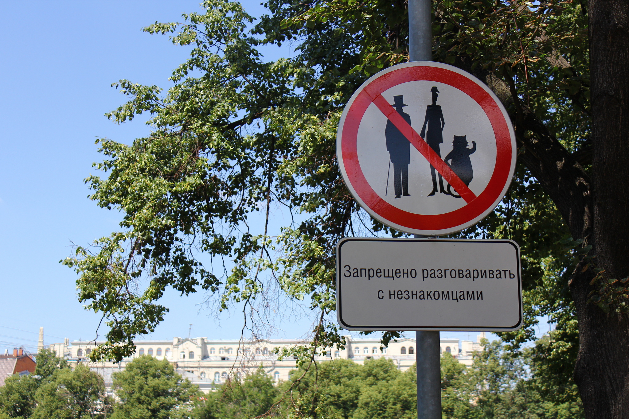 В 2012-м мы с другом придумали знак «Запрещено разговаривать с незнакомцами» и повесили его на Патриарших прудах в Москве. Затем другу написал директор Музея Булгакова: нашу табличку берут под покровительство. По сути мы сделали московского Чижика-Пыжика. Но знак с Патриарших постоянно воровали. Мой друг первое время за свои деньги делал новые.