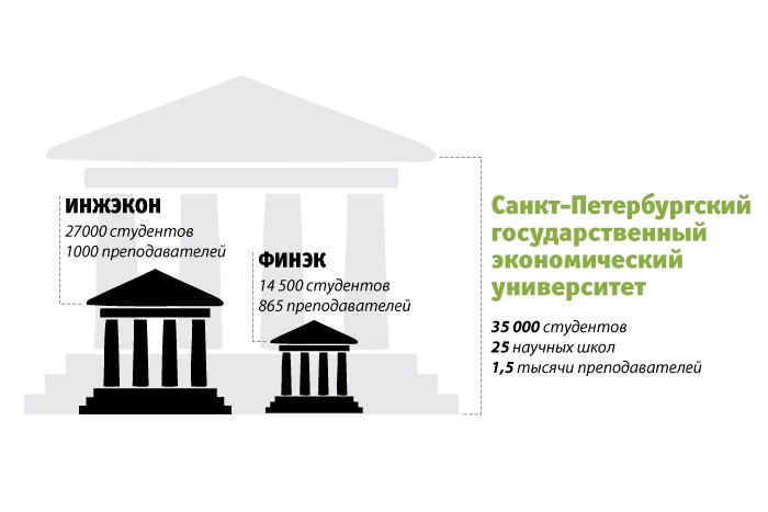 Сегодня стало известно, что в городе появится новый вуз — Санкт-Петербургский государственный экономический университет. Приказ о создании нового федерального университета на базе ФИНЭКа и ИНЖЭКОНа был подписан в Министерстве образования и науки 1-го августа. «Бумага» узнала, чем новый университет лучше двух старых и кто же будет главным в их союзе.
