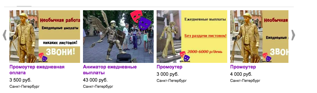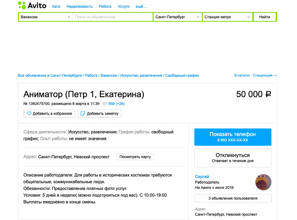 Сейчас на «Авито» по запросу «аниматор» вакансий от Сергея Самусенко больше нет. Вакансии живых статуй опубликованы от имени профиля SPBEvent.