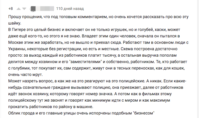 — Скажу только одно. В интернете много наговаривают на эти костюмы, на самом деле там адекватные ребята работают. Просто их не считают за людей. Начальство ставит очень жесткие условия для работы. Вы попробуйте в Питере зимой простоять 10 часов на улице. Никто не грабит людей: им озвучивают суммы разные, и кто-то соглашается с этими суммами, а кто-то нет.