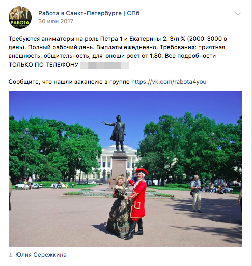 Кроме того, в пабликах, посвященных работе в Петербурге, «Бумага» нашла еще одно объявление о наборе Петров и Екатерин — от 2013 года. В этом объявлении указан номер Сергея Владимирова. Это же имя называл бывший аниматор, отвечая на вопрос о руководителе.