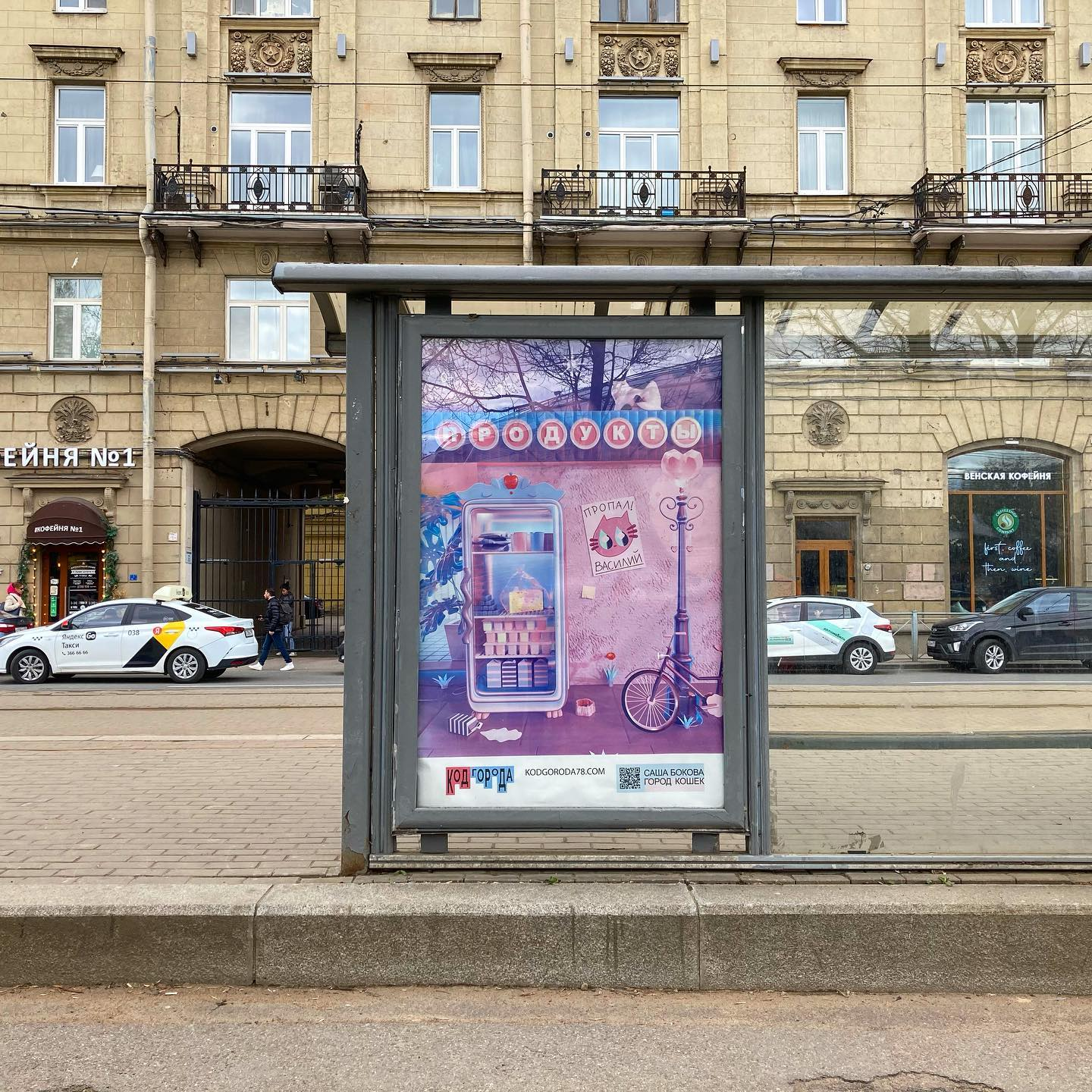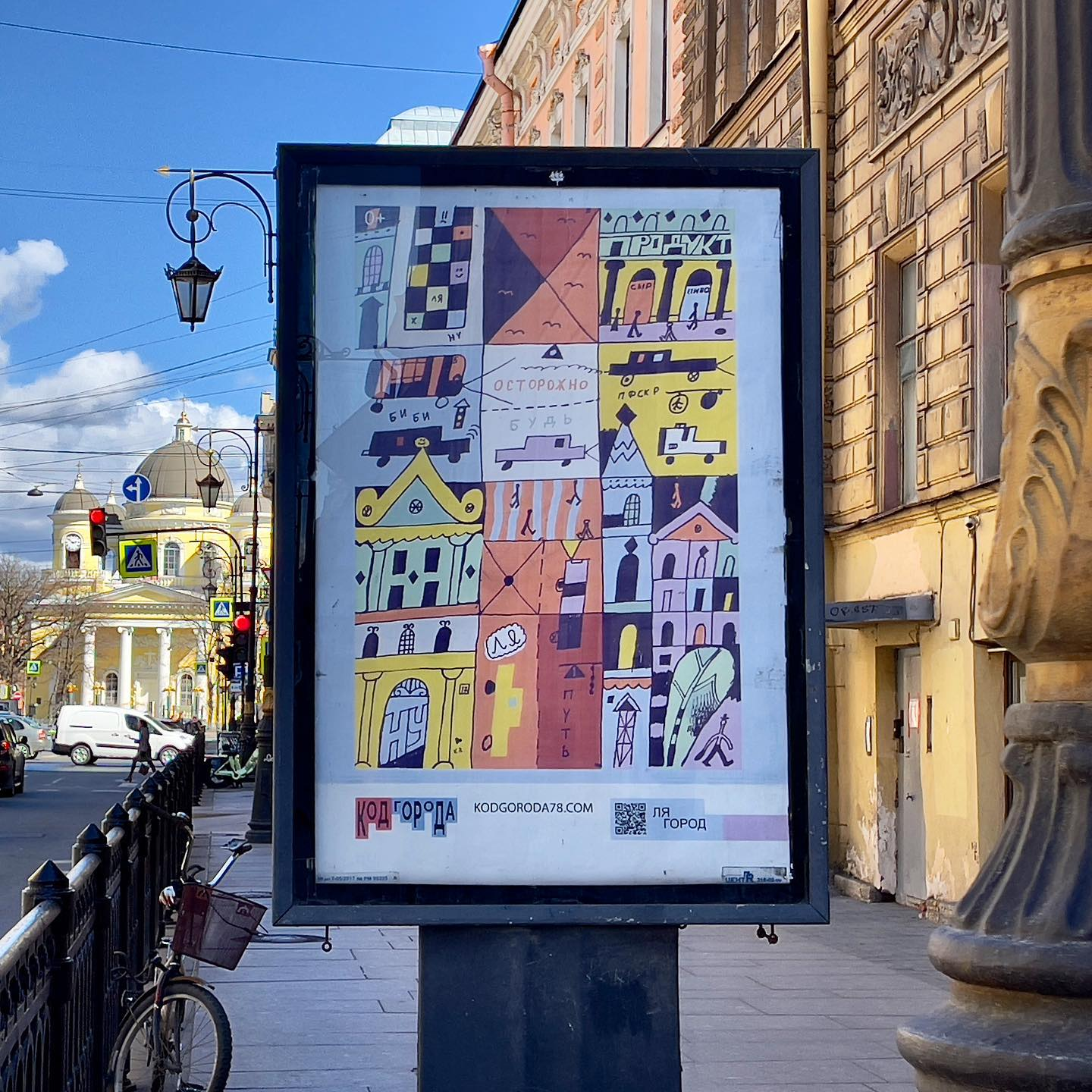 В мае в разных районах Петербурга в лайтбоксах появились плакаты с работами петербургских дизайнеров, иллюстраторов и уличных художников. Это выставка «Код города 78». Ее организовали при поддержке школы дизайна ВШЭ и агентства dataduck, а также городского комитета по развитию туризма.