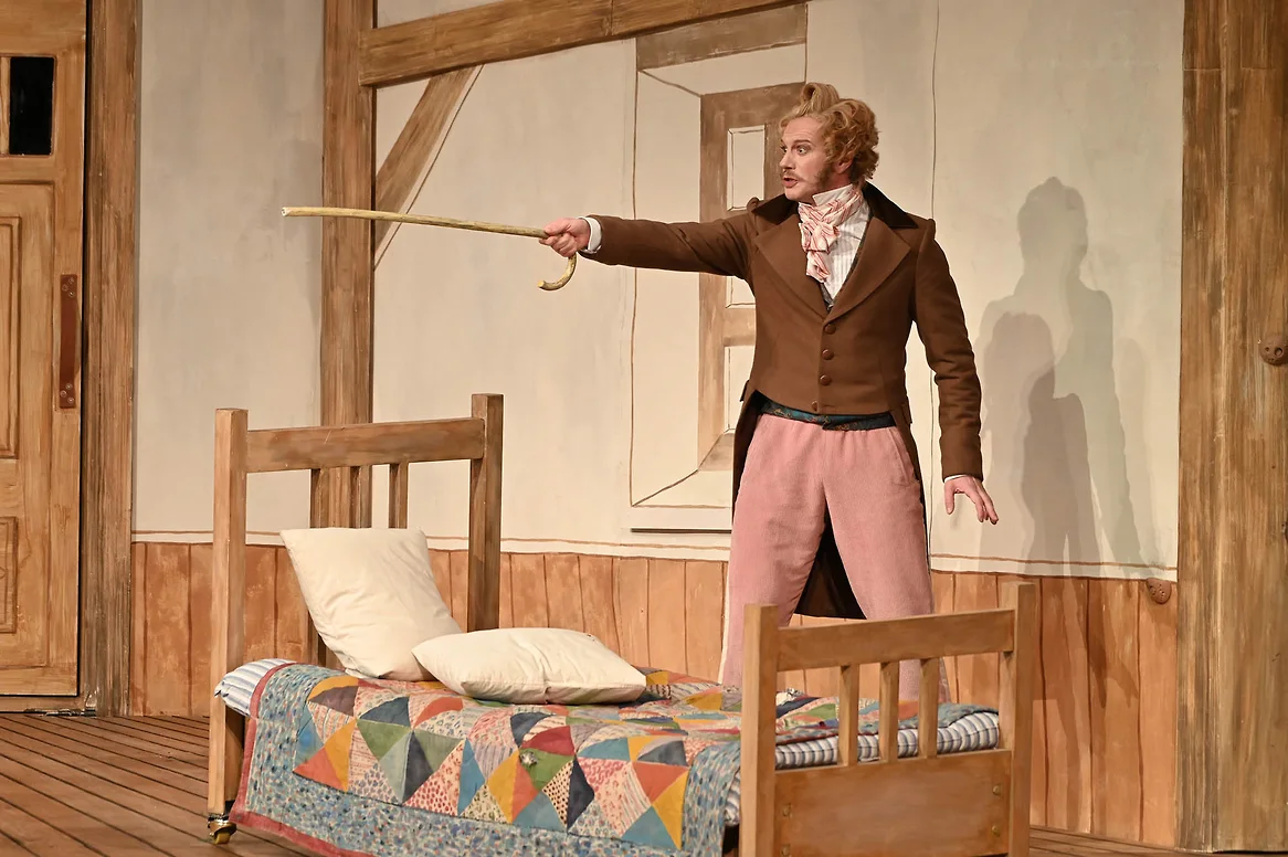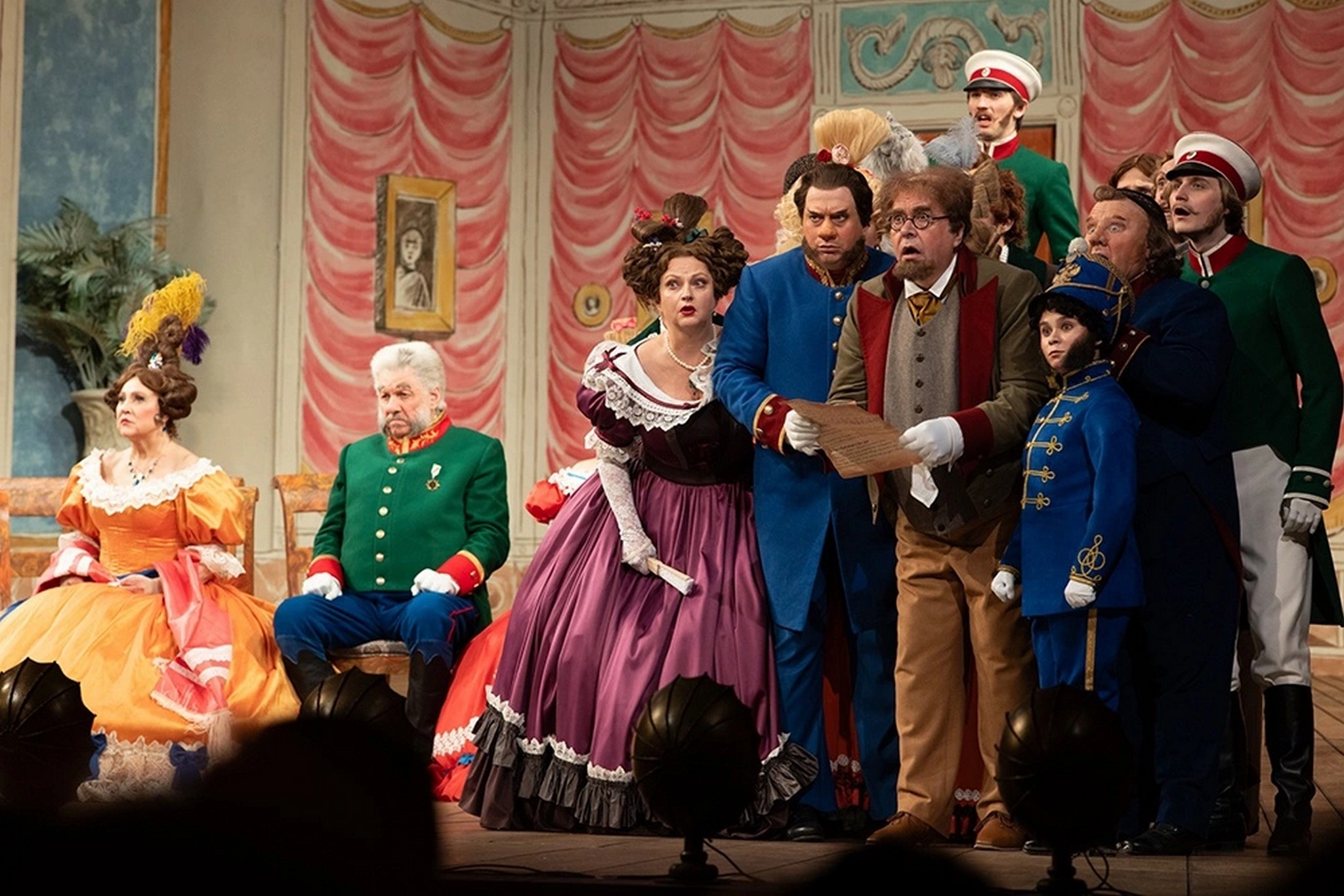 Дополнительно действие помещается в рамку еще одного плоскостного нарисованного занавеса, который как бы драпируется «вокруг» разыгрываемых сцен. Этот третий занавес становится кавычками для представления, одной из подсказок режиссера, что нарочитый традиционализм спектакля — двусмысленный. Иронично выглядит и дивертисмент между действиями — например, девицы в золотых платьях исполняют романсы Алябьева и гимн Российской империи. Во время исполнения гимна абсолютно все актеры и технические работники сцены выстраиваются перед изображением Главного штаба и с выражением благоговейного почтения внимают словам, прославляющим империю.