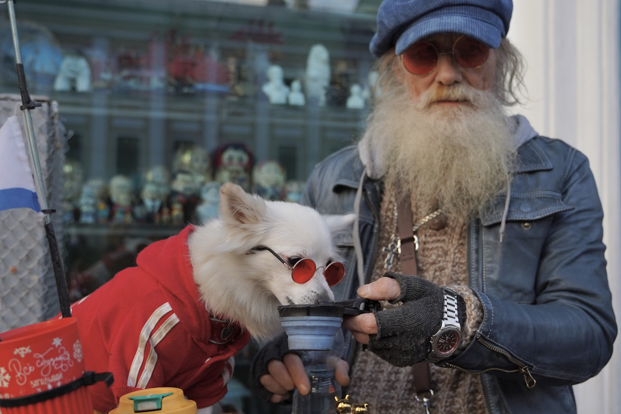 Мужчина почти не реагирует. В его розовых круглых очках отражаются недовольные лица. Его зовут Владимир Михайлович. Его собачка Белла — в похожих очках, в белой шубке и с маленькой красной шляпой на резиночке — смотрит на своего спокойного хозяина.